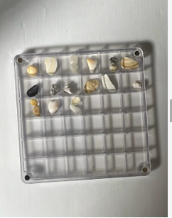 Sim, as caixas podem conter fósseis planos ou pequenas pedras semipreciosas.